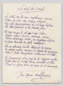 HEREDIA (José-Maria de). Les Trophées. P., Lemerre, 1893. In-8, br., couv. impr., étui et boite moderne. EDITION ORIGINALE. L’UN DES 25 EXEMPLAIRES NUMEROTES SUR PAPIER WHATMANN Exemplaire d’une grande fraîcheur auquel on a ajouté un sonnet autographe signé (une page in-4 ) : Le récif de corail, publié dans l’ouvrage (page 128).