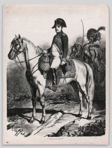 NORVINS (de). Histoire de Napoléon. Vignettes par Raffet. P., Furne, 1839. Grand in-folio en hauteur. Lithographie originale signée de Raffet (Giacomelli, 121), datée de 1838, sans aucune lettre, avec l’adresse de l’imprimeur Auguste Bry (tirage 1840-1841), signalée par Giacomelli comme très rare, elle a été reproduite par M. Maindron dans « Les Affiches illustrées » (1886, p. 63). L’Empereur est représenté sur un cheval blanc, au repos, portant le frac des Chasseurs de la garde, tenant une lorgnette de la main gauche, au second plan un guide de la garde. (Superbes noirs, qqs. plis cassés). Joint : le n° 128 vt. nov. 23. Ens. 2 pièces.