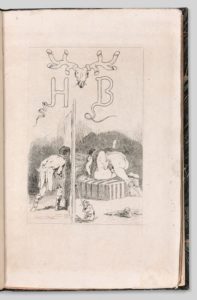MERIMEE (Prosper). H B par un des quarante. Avec un frontispice stupéfiant dessiné et gravé par S.P.Q.R. Eleutheropolis : l’an MLCCCLXIV de l’imposture du Nazaréen [Bruxelles, Poulet-Malassis, 1864]. In-18, Bradel demi-maroq. vert. Titre imprimé en rouge et noir, couv. rose cons. Troisième édition de H B [=Henri Beyle]. L’originale de 1850 ne fut tirée qu’à 25 exemplaires, et la première à contenir le frontispice libre, gravé par Félicien Rops, tiré sur Chine. TIRAGE A 140 EXEMPLAIRES, numérotés et paraphés. «C’est à cause du caractère libre de cette gravure, que cette réédition des pages de Mérimée sur son ami Henry Beyle a été classée dans l’Enfer de la Bibliothèque Nationale» (Pia). BEL EXEMPLAIRE A GRANDES MARGES. Pia Enfer, 601 ; Launay, 283