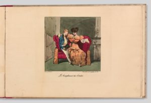 MONNIER (Henry). Rencontres parisiennes. Macédoine pittoresque P., Gihaut (lithogr. de Senefelder), s.d. (1827). Pet. in-4 oblong, cart. de l’édit. EDITION ORIGINALE. Bel album composé d’un titre illustré et 19 lithographies coloriées à l’époque et à grandes marges. Rare. Monnier, qui se destinait à être notaire, quitta l’Etude pour laquelle il travaillait pour entrer dans l’atelier de Girodet. Il s’intéressa alors à la caricature et développa rapidement son sens improvisé et plein d’observation. Ses dessins sont devenus à la mode à partir de 1825. Monnier fut également un acteur célèbre et montra autant d’originalité avec ses personnages sur les planches qu’avec ses caricatures.