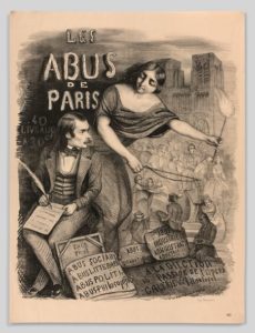 ABUS DE PARIS (Les), par M*** (J.-B. Viollet d’Epagny et Francis Girault). Illustrations par M. M. Emile, A. Baron et Seigneuries. 40 livraisons à 30 cts. A la direction, 16 passage de l’Opéra, Galerie de l’Horloge (Breteau, 1844), grand in-folio en hauteur (lég. trace de pli au centre). Superbe et très rare affiche d’intérieur lithographiée (Impr. Fourquemin), imprimée sur papier chamois, ornée d’une grande composition d’après Emile Pinot, représentant l’écrivain Francis Girault, la plume à la main, découvrant la ménagerie parisienne que lui présente une jeune femme, tenant un fouet d’une main, un flambeau de l’autre, au fond Notre-Dame.