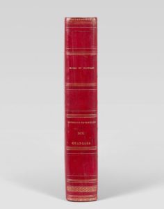 RISSO (Antoine) et POITEAU (Antoine). Histoire naturelle des Orangers. Ouvrage orné de 109 figures peintes d’après nature. P., Imprimerie de Mme Hérissant Le Doux, 1818-1822. In-folio (350 x 260 mm), demi-maroq. rouge à long grain, dos orné or et à froid, non rogné (Rel. de l’époque). Très bel et rare ouvrage, renfermant 109 superbes planches gravées, imprimées en couleurs et rehaussées à la main. PREMIERE EDITION DE CET « OEUVRE MAGNIFIQUE ET INSPIRANT » (Grands Livres de Fleurs). Antoine Risso, naturaliste et pharmacien français devenu directeur du Jardin de Naturalisation de Nice, fut un « botaniste pionnier des Alpes Maritimes » (Stafleu). Dans sa dédicace à la duchesse de Berry, il évoque son enfance italienne : « Votre Altesse Royale, en retraçant ses yeux l’image des fruits qu’elle cueillit souvent de sa propre main sous le beau ciel de l’Italie ». Les planches de type Redouté sont toutes issues des dessins d’Antoine Poiteau (1766-1854). Au début de sa carrière, Poiteau enseigna la botanique et fut employé comme jardinier ; il entreprit ensuite une expédition de cueillette de plantes dans les Caraïbes. De retour à Paris en 1800, il se concentre sur son travail d’illustrateur d’ouvrages botaniques. Poiteau est souvent cité comme co-auteur et illustrateur du présent ouvrage, car, en plus de fournir les dessins, il a également fourni des informations sur les variétés tropicales. L’ouvrage fut publié en 19 fascicules (ou parties) entre juillet 1818 et août 1820, et constitue l’une des productions les plus spectaculaires de l’imprimerie couleur parisienne du début du XIXe siècle : « Ces oranges et citrons et leurs relations, avec les feuilles, les fleurs, et souvent des coupes transversales ainsi que des fruits entiers, forment l’un des enregistrements les plus beaux et les plus complets des variétés connues au XIXe siècle» (Raphaël, An Oak Spring Pomona). TRES BEL EXEMPLAIRE, RELIE A L’EPOQUE ET DE TOUTE FRAICHEUR. Nissen BBI, 1640 ; Grands livres de fleurs p.73 ; Dunthorne, 263 ; Stafleu & Cowan 9248. Provenance : - Bibliothèque La Rochefoucauld Duc de Bisaccia (ex-libris).
