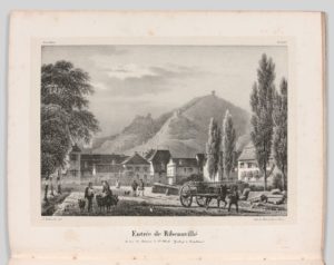 ROTHMULLER (Jacques). Vues pittoresques des Châteaux, Monuments et Sites remarquables de l’Alsace, dessinées d’après nature & lithographiées par J. Rothmuller, avec texte historique et descriptif. Colmar, Hahn et Vix, s.d. (1839). In-4, non paginé, demi-veau bleu, dos orné or et à froid, (Rel. de l’époque). Bel ouvrage illustré par Jacques Rothmuller, né et mort à Colmar (1804-1862), d’un titre lithogr. tiré en deux tons et 124 lithographies tirées hors-texte. (qq. lég. rouss.). EXEMPLAIRE BIEN COMPLET ET DANS UNE AGREABLE RELIURE ROMANTIQUE. Waltz, Bibliographie de la ville de Colmar, n° 445.