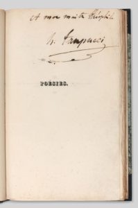 TAMPUCCI (Hippolyte). Poésies. Seconde édition, augmentée de poésies nouvelles. P., Paulin, 1833. In-4-8, demi-maroq. bleu à grain long, dos orné en long à petits fers, coins, non rogné., couv. et dos cons. (Mercier). Edition en partie originale, extrêmement rare, ornée d’un très beau frontispice dessiné et gravé par Célestin Nanteuil, tiré sur Chine fixé. Superbe exemplaire, portant sur le faux-titre cette précieuse dédicace signée : « A Mon Maître Théophile ». Tampucci était surveillant au Collège Charlemagne, ses poèmes sont dédiés à Th. Gautier, V. Hugo, Béranger Provenance : - Bibliothèque Mercier - Bibliothèque Villeboeuf (chiffre frappé or à l’intérieur, à un angle) - Bibliothèque A. Lambiotte (Partie V, Paris 1976, n° 94).