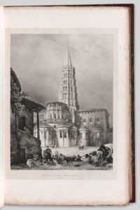 TAYLOR (J.), Ch. Nodier et A. de Cailleux. Voyages pittoresques et romantiques dans l’ancienne France : Languedoc. Paris, Imprimerie Didot Ainé, Gide, Engelmann, 1833-1837. 4 forts volumes grand in-folio (535 x 355 mm), demi-maroquin rouge à long grain, coins, dos ornés or et à froid, entièrement non rognés (Rel. de l’époque). Edition originale. «L’une des premières et des plus importantes productions françaises de la lithographie » (Brunet). Ces 4 volumes, consacrés au Languedoc, sont parmi les plus beaux de la série. Ils sont ornés d’un frontispice et de 546 planches lithographiées dont 448 sur Chine collé, par Théophile Fragonard, Chenovard, Dauzats, Chapuy, Viollet-le-Duc, Challamel, Rouargue, Tony Johannot, etc. Ces planches sont datées entre 1833 et 1840. Les pages de texte sont également habillées de très beaux et parfois spectaculaires encadrements variés réalisés notamment par Théophile Fragonard, Célestin Nanteuil, Massé, Fries, Victor Adam, Viollet-le-Duc, etc., intégrant plusieurs grandes et petites vignettes. Premier recueil du patrimoine français. Sous l’impulsion de Charles Nodier, James Taylor et Alphonse de Cailleux, l’entreprise des Voyages pittoresques et romantiques est pharaonique : la collection complète comporte 24 volumes publiés par Firmin Didot entre 1820 et 1878, couvre toutes les régions de France et comporte près de 3 000 planches. Rousseurs éparses, insignifiantes, ce qui est rare pour cet ouvrage.