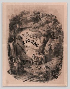 TOPFFER (Rodolphe). Voyages en zigzag, ou excursions d’un pensionnat en vacances dans les cantons suisses 50 livraisons à 30 cent. Paris, J.J. Dubochet, 1844. Gd. in-fol. en hauteur (lég. trace de pli au centre, et de repport). Cette importante et rare affiche romantique, imprimée sur papier chamois, entièrement lithographiée (Villain lith.) est recouverte d’une composition de Calame, inspirée de l’ouvrage, celle-ci a été reproduite dans « Les Affiches illustrées » de M. Maindron (1886, p. 71) et citée dans cette ouvrage (p. 86) « Et Calame ! N’est-il rien de plus jeune et de plus délicieux que ses compositions des Voyages en zigzag Ce sont là de véritables tableaux, et non les moins charmants de ceux qu ’il nous a laissés ».