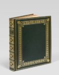 VERNET (Carle). Cris de Paris, dessinés d’après nature. P., Delpech, s. d. (vers 1820). In-folio (360 x 283 mm), maroq. vert à grain long, plats décorés d’une large dentelle accompagnée de plusieurs jeux de filets, fleurons d’angle, le tout doré, dos richement orné, double et gardes de soie moirée grenat, la double avec un large encadr. de maroq. orné de 7 filets gras et maigres, tranches dorées sur témoins, étui (Mercier, succr de Cuzin). SUITE COMPLETE et très rare d’un titre lithographié et 100 planches par Carle Vernet lithographiées et coloriées à l’époque. L’UNE DES PLUS CELEBRES SERIES DE L’EPOQUE ROMANTIQUE, RARE COMPLETE. Vernet dresse ici un catalogue pittoresque des colporteurs parisiens, du fondeur de cuillère d’étain à la marchande de paillassons sans oublier le tondeur de chiens, Jean, qui «tond les chiens proprement et va en ville». The celebrated series, prized by the sociologist as well as the historian of costume, has become almost unfindable complete because of an insatiable demand from Hôtelkeepers seeking wall decorations (Ray). SUPERBE EXEMPLAIRE, EXCEPTIONNEL SINON UNIQUE, somptueusement relié par Mercier. Il renferme une seconde suite en noir de toute les pièces (sauf la pl. 72), toutes sont montées sur onglets et le très rare portrait de Carle Vernet (en pied, dessinant dans un paysage) par son fils Horace, lithographie incunable, (datée 1818), également coloriée à l’époque, a été ajoutée au début du recueil. (Rares rousseurs.) Ray French I, 121 ; Colas II, 2986 ; Lipperheide I, 1186. Provenance: - BIBLIOTHEQUE VILLEBOEUF (relié à son chiffre).