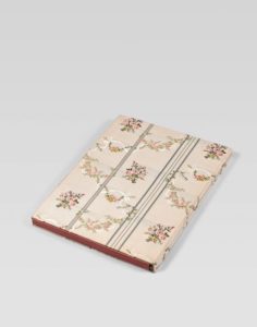 VIGNY (Alfred de). Pierrette. Episode de la Vie de Sedaine, tiré de Grandeur et Servitude Militaire. Illustré d’aquarelles originales (trente-cinq) de E. Grivaz. S. l. n. d. (Paris, pour Madame Jean Durenne), vers 1900. In-4 en ff., dans un portef. de moire crème avec décor broché de rubans, fleurs et feuillages, doubl. intér. et rabats de satin rose, dans un étui à chemise demi-maroq. bleu clair avec titre or, doubl. de satin amande. Ce superbe livre unique, dont le texte avec titre et faux-titre, d’une très belle typographie, imprimé d’un seul côté, est un épisode de Servitude, chapitre V : Les Enfants de Montreuil et le tailleur de pierres, tiré sur un magnifique papier Whatmann (filigrané et daté de 1897) est enrichi de 35 aquarelles originales de Eugène Grivaz (aquarelliste réputé, peintre de genre, né à Genève en 1852), un certain nombre signées, aux couleurs vives et fraîches rappelant celles exécutées peu auparavant par Ed. de Beaumont pour la célèbre édition des Contes de Perrault. Elles représentent des scènes champêtres avec jeunes filles ou jeunes femmes dans de jolis costumes, des paysages, des coiffes et rubans, une diligence, des instruments de musique ou loges de théâtre, des sujets gastronomiques, enfin un portrait de Sedaine et de la Reine Marie-Antoinette (avec un amour et surmonté de la couronne royale). Ainsi qu’il en est fait mention sur le faux-titre toutes ces aquarelles ont été exécutées pour Madame Jean Durenne. Un texte de traduction en langue anglaise, imprimé sur papier mince, est joint face au texte français. JOLI LIVRE UNIQUE, TYPIQUEMENT 1900, aux aquarelles de toute beauté et fraîcheur, en séduisante condition du temps.
