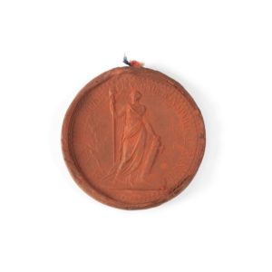 CACHET CIRCULAIRE EN CIRE ROUGE — Napoléon Bonaparte Premier Consul — Grand sceau de la République française utilisé pour les documents officiels — Représentant la République debout de face tenant dans la main droite une haste surmontée...