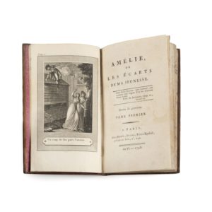 CURIOSA. — Amélie ou Les Écarts de ma Jeunesse. Paris, Dentu, 1798. — 2 vol. in-12, I : faux-titre, titre, 196 pp., II : faux-titre, titre, 206 pp., veau raciné, triple filet à froid, dos lisse orné, pièces de titres et de tomaison rouges...