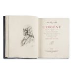VOLTAIRE. — L'Ingénu. — Histoire véritable tirée des manuscrits du Père Quesnel. — Paris, Auguste Blaizot, 1927. — 2 vol. in-4, tome I : maroquin bleu roi avec riche composition mosaïquée sur les plats représentant une grille dorée et...