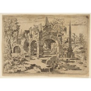 ƒ-Léon DAVENT (act.1540-1556) — Paysage au au tombeau et arches et à l'obélisque — Eau-forte — Belle épreuve — Pliure verticale avec petite déchirure en haut et autres pliures, déchirures (sur le bord gauche)