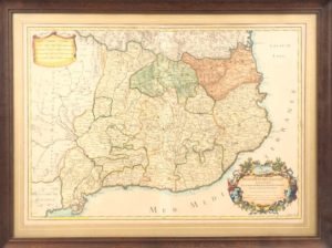 [CATALOGNE]. SANSON (N.). PRINCIPAUTÉ DE LA CATALOGNE où sont compris Les Comtés de Roussillon et de Cerdagne divisés en leurs Vigueries. P., Jaillot, 1706. Carte sous verre (65 X 45,5 cm environ), cadre bois. CARTE TOUT DÉBUT XVIIIe GRAVÉE ET AQUARELLÉE avec un joli cartouche.