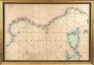 [CORSE]. ROUX (J.). IIIe FEUILLE. Marseille, Joseph Roux, 1764. Carte (83,5 X 56 cm environ) sous verre, cadre bois doré. CARTE GRAVÉE ET AQUARELLÉE du GOLFE DE LYON et du GOLFE DE GÊNES avec la CORSE et la partie nord de la Sardaigne entièrement aquarellées. Cette « IIIe feuille » est tirée du Recueil des Principaux Plans, des Ports et Rades de la Mer Méditerranée réalisée en 12 feuilles par J. Roux.