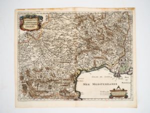 [LANGUEDOC]. PRAEFECTURA GENERALIS LANGUEDOCIAE, olim Occitania dicta [et] [MÉRIAN]. GOUVERNEMENT GÉNÉRAL DU LANGUEDOC divisé en ses Vingt-deux Diocèses. [c. 1690 – c. 1650]. Deux cartes (59 X 48,5 cm et 35,5 X 27,5 cm environ), la 1ère carte contrecollée sur carton. CARTES GRAVÉES AU XVIIe avec rehauts d’aquarelle et cartouche colorié pour la 2nde carte.