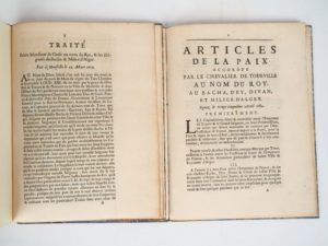 [ALGÉRIE]. TRAITÉ entre Monsieur de Guise au nom du Roi, les Députés du Bacha Milice d’Alger. Fait à Marseille le 21 Mars 1619 - TRAITÉ entre les Sujets au nom du Roi ceux d’Alger pour le Commerce. Fait à Alger le 19 Septembre 1628. In-4 Bradel papier marbré, pièce de titre au dos (Reliure moderne) ; 8 pp. ENSEMBLE DE 2 RARES TRAITÉS entre la France et l’Algérie imprimés au début du XVIIe siècle – ARTICLES DE LA PAIX accordée par le Chevalier de Tourville au nom du Roy, au Bacha, Dey, Divan, et Milice d’Alger. Signez le 25 avril 1684. In-4 Bradel papier marbré, pièce de titre au dos (Reliure moderne) ; 8 pp. ENSEMBLE DE 2 OUVRAGES.