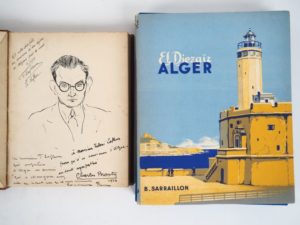 [ALGÉRIE]. SARRAILLON (B.). EL-DJEZAÏR ALGER. [Alger, édité par l’artiste, 1958]. Grand in-4 broché, étui. ÉDITION ORIGINALE. LITHOGRAPHIES à pleine page. Tirage limité à 650 exemplaires. UN des 500 numérotés sur Alfa-cellunaf, celui-ci non justifié – SARRAILLON (B.). LA CORSE, île enchantée. [Alger, édité par l’artiste, 1960]. Grand in-4 broché. ÉDITION ORIGINALE. LITHOGRAPHIES en noir et en couleurs. Tirage limité à 650 exemplaires. UN des 25 justifiés « hors-commerce » parmi les 175 numérotés sur vélin d’Arches – FAVRE (L.). TOUT L’INCONNU DE LA CASBAH D’ALGER. [Alger, édité par l’artiste, 1960]. Grand in-4 basane maroquinée fauve, plats ornés à froid d’un décor oriental, dos lisse muet, couverture conservée (Reliure de l’époque). ÉDITION ORIGINALE. DESSINS en noir de Charles BROUTY. Exemplaire enrichi sur le 1er f. blanc d’un E.A.S. de l’auteur et de l’illustrateur avec un DESSIN ORIGINAL (portrait de Frédéric Lafleur) – CARRIÈRE (P.). ALI PRINCE KABYLE. P., Éditions de Port-Royal, 1947. In-12 à l’italienne broché. ENFANTINA illustré de dessins couleurs par Jean FERRIEU. ENSEMBLE DE 4 OUVRAGES.