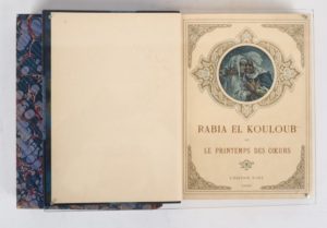 BEN IBRAHIM (S.). RABIÂ EL KOULOUB ou LE PRINTEMPS DES CŒURS. Légendes sahariennes. P., L’Édition d’Art, 1902. Petit in-4 chagrin poli noir à coins, dos à nerfs orné d’un fleuron doré, titre et tête dorés, couverture conservée, étui bordé (Reliure postérieure). Teinte du dos uniformément virée en teinte havane. ÉDITION ILLUSTRÉE de 50 AQUARELLES reproduites en couleurs d’Étienne DINET. Tirage limité à 300 exemplaires, dont 260 numérotés sur vélin BFK de Rives. Exemplaire numéroté en chiffres romains (n°XXXXI), imprimé sur BFK de Rives, contenant un ÉTAT supplémentaire des illustrations en noir, état réservé aux 40 exemplaires sur Japon du tirage de tête.