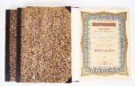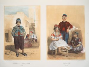 BERBRUGGER (Louis-Adrien). ALGÉRIE HISTORIQUE, PITTORESQUE ET MONUMENTALE. Recueil de vues, monuments, cérémonies, costumes, armes et portraits dessinés d’après nature, avec texte descriptif des localités, mœurs, usages, jeux et divertissements des habitants de l’Algérie. Paris, Chez J. Delahaye Éditeur, 1843. Cinq parties reliées en 3 volumes in-folio ½ basane brune à coins, dos lisse cloisonné de filets or, titre doré (Koenig). Des planches roussies, comme toujours. ÉDITION ORIGINALE, très rare complète. Un TITRE chromolithographié par Rigot, 134 PLANCHES lithographiées (dont une en couleurs, planche des jeunes garçons juifs et des enfants maures, volume III), 123 à deux teintes et dix de botanique en couleurs, 2 CARTES et 25 vignettes lithographiées en noir dans le texte, le tout d'après Bour, Bro, Flandin, Genet, Philippoteaux, Raffet, etc. Tirage limité à 500 exemplaires. SÉDUISANT EXEMPLAIRE en reliure signée de l’époque, condition rare. ¶ Brunet, I, 782 - Colas, I, 298 - Playfair, 984 - Tailliart, 718 : « Très belles planches ; quelques pages d’un texte explicatif. Ouvrage très rare. »