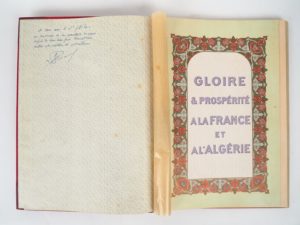 LÉON (M.). ALBUM HISTORIQUE ARTISTIQUE des sceaux officiels des gouverneurs généraux de l’Algérie depuis la conquête jusqu’en 1934. Alger, M. Léon, 1934. In-plano ½ basane rouge à coins, dos lisse muet, étui (Reliure de l’époque) ; (39) ff. montés sur onglets. ÉDITION ORIGINALE de cet ouvrage TRÈS RARE. Tirage limité à 260 EXEMPLAIRES. E.A.S. au verso de la 1ère garde : « à mon ami le Dr Witas / en souvenir de son assistance dévouée auprès de mon beau-frère Marcel Léon / auteur et éditeur de cet album [signature] ». Chaque page est ornée d’un encadrement polychrome à décor orientaliste.