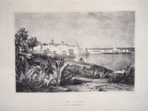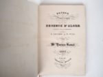 LESSORE (E.) - WILD (W.). VOYAGE PITTORESQUE DANS LA RÉGENCE D’ALGER, exécuté en 1833. Paris, Ch. Motte, 1835. In-folio ½ basane fauve à coins, dos à nerfs, pièce de titre (Reliure moderne) ; (1) f. de titre, 20 pp. de texte, 50 pl. Ex-libris « Gérard Sangnier ». Quelques pointes de rousseurs aux ff. de texte et les planches ont dû être lavées avec soin car elles sont sans rousseurs mais ont gardées un beau contraste. ÉDITION ORIGINALE de ce BEL ET RARE OUVRAGE contenant un TITRE et 50 PLANCHES h.-t. dessinées par Émile Lessore et William Wyld et lithographiées par Ch. Motte. ¶ Tailliart, 896 : « De très belles gravures, très précieuses pour la connaissance du vieil Alger ; une notice pour chaque gravure. »