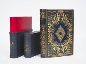 NODIER (Charles). JOURNAL DE L’EXPÉDITION DES PORTES DE FER. Paris, Imprimerie Royale, 1844. Grand in-8 maroquin bleu nuit entièrement décoré d’encadrements et compartiments dorés ornés d’un décor floral et semés de fleur de lis, grand fleuron central aux petits fers dans un encadrement en réserve polylobé, dos à nerfs compartimenté et fleurdelisé, large dentelle intérieure, tranches dorées, étui (Duru 1856 – Marius Michel doreur). ÉDITION ORIGINALE imprimée sur vélin de l’UN DES PLUS BEAUX LIVRES DU XIXe siècle consacrés à la conquête de l’Algérie. Cet ouvrage retrace notamment l'expédition du duc d’Aumale en Algérie en 1839. Une CARTE dépliante de l'Algérie, de nombreuses vignettes sur bois dans le texte et 40 FIGURES sur bois h.-t. tirées sur chine et collées sur vélin fort sous serpentes légendées, par Raffet, Descamps et Dauzat. Cet ouvrage hors-commerce était destiné aux membres de l'expédition de 1839 et à la famille d'Orléans. JOINT une LETTRE AUTOGRAPHE SIGNÉE (3 pages sur f. double à en-tête imprimé Armée d’Afrique – Province de Constantine) de Henri d’Orléans, duc d’Aumale (1822-1897), datée Constantine 3 août 1844 : il s’agit d’une liste de noms, candidats désignés comme pouvant être proposés pour l’avancement aux grades de capitaine, lieutenant, etc. MAGNIFIQUE EXEMPLAIRE, sans la moindre rousseur, dans une SPECTACULAIRE ET REMARQUABLE RELIURE EN MAROQUIN réalisée par Hippolyte Duru en 1856 et supérieurement DORÉE par Marius Michel. De la bibliothèque Henri LAFOND (ex-libris). ¶ Tailliart, 1730 – Playfair, 1064 – Clouzot, 228 : « Important ouvrage » – Provenance : Vente Livres romantiques bibliothèque Henri Lafond, Giquello, 12 juin 2015, n°130.