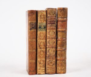 [MILITARIA]. GRANDMAISON (Ph. Aug. Th. de). LA PETITE GUERRE, ou Traité du service des troupes légères en campagne. S.l.n.e., 1756. Deux parties reliées en un volume in-12 basane fauve marbrée, dos à nerfs orné, pièce de titre grenat, tranches rouges (Reliure de l’époque). Épidermures sur les plats, 1 coin émoussé. ÉDITION ORIGINALE de cet ouvrage fondateur qui expose la doctrine de « petite guerre », que l’on nomme aujourd’hui « guerre de harcèlement », « guerre non conventionnelle » ou bien encore « guérilla » – MICHEL (Major du Régiment d’infanterie de Rochefort). ORDONNANCES MILITAIRES DU ROY, réduites en pratique, et appliquées au détail du service. P., Mariette, 1714. In-12 veau fauve granité, dos à nerfs orné, tranches mouchetées en rouge (Reliure de l’époque). ÉDITION imprimée la 1ère fois en 1707 – ORDONNANCE DU ROI, pour régler l’exercice de ses troupes d’infanterie, du premier juin 1776. Lille, Peterinck-Cramé, 1776. In-12 basane fauve marbrée, dos lisse cloisonné et orné, pièce de titre vert lierre, tranches rouges (Reliure de l’époque). PREMIÈRE ÉDITION – PLANCHES RELATIVES AU RÈGLEMENT concernant l’exercice et les manœuvres de l’infanterie. Du premier août 1791. Lille, Deboubers, 1793. In-12 basane fauve granitée, dos lisse cloisonné de roulettes dorées, pièce de titre (Reliure de l’époque) ; 95 pp., 40 pl. Coiffes et coins restaurés. PREMIÈRE ÉDITION. 40 PLANCHES, la plupart dépliantes. ENSEMBLE DE 4 OUVRAGES.