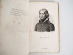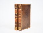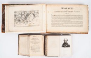 [MILITARIA]. MONUMENS DES VICTOIRES ET CONQUÊTES DES FRANÇAIS DE 1792 À 1815. [P., C.L.F. Panckoucke, c. 1822]. Grand in-4 à l’italienne ½ basane fauve à coins, dos à nerfs orné de guirlandes dorées, titre doré (Reliure moderne). Rousseurs. RECUEIL constitué de 99 PLANCHES gravées sur cuivre au trait, d’une CARTE et de ff. de texte explicatif : du Plan de la route du Simplon à Napoléon blessé devant Ratisbonne – PORTRAITS DES GÉNÉRAUX FRANÇAIS, faisant suite aux Victoires et conquêtes des Français de 1792 à 1815. P., C.L.F. Panckoucke, 1818. Deux volumes in-8 basane fauve granitée, encadrement de roulette dorée sur les plats, dos lisse cloisonné et orné, pièces de titre et de tomaison (Reliure de l’époque). Ex-libris héraldique « Merillon ». ÉDITION ORIGINALE. 12 pp. de prospectus et 120 PORTRAITS gravés h.-t. avec texte biographique en regard. ENSEMBLE DE 2 OUVRAGES.