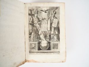 [BIBLE]. BIBLIA SACRA vulgatae editionis Sixti V. Clem. VIII. [etc.]. Venetiis [Venise], N. Pezzana, 1742. Fort volume petit in-folio, vélin ivoire souple de l’époque ; (10) ff., 1060 pp., LXIV pp. de table. Ex-libris héraldique « Eugène Castel » [1883-1949]. Mouillure brune en marge inférieure des premiers ff., sans atteinte au texte, petits manques de vélin aux coupes de la reliure. ÉDITION XVIIIe ILLUSTRÉE de la vulgate sixto-clémentine. BEAU FRONTISPICE et une vignette de titre gravés sur cuivre ainsi que de nombreux BOIS dans le texte. ¶ Delaveau et Hillard, 1118, pour l’édition de 1732.
