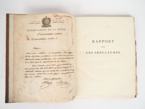 CAMBRY (J.). RAPPORT SUR LES SÉPULTURES, présenté à l’administration centrale du département de la Seine. P., Didot l’ainé, an VII [1799]. Grand in-4 veau ½ vélin ivoire, dos lisse, titre frappé en noir (Reliure de l'époque) ; (1) f. manuscrit monté sur onglet, (2) ff. de faux-titre et titre, II-83 pp., 9 pl. ÉDITION ORIGINALE. 9 PLANCHES dépliantes gravées. Ouvrage truffé d’une LETTRE AUTOGRAPHE SIGNÉE [Lauger ?] à en-tête gravé du « Département de la Seine », contresignée par l’auteur.