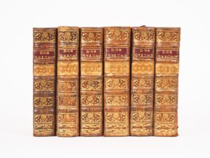 CERVANTÈS (M. de). HISTOIRE DE L’ADMIRABLE DON QUICHOTTE DE LA MANCHE. Francfort, Bassompierre, 1750. Six volumes in-12 basane fauve marbrée, dos à nerfs orné, pièces de titre et de tomaison maroquin grenat et citron, tranches rouges (Reliure de l'époque). Début de fente à un mors et quelques accrocs sans gravité. ÉDITION ILLUSTRÉE de 6 FRONTISPICES et 32 FIGURES par Demeuse. SÉDUISANT EXEMPLAIRE en reliure d’époque, COMPLET des figures.