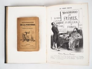[DAUMIER]. DAUMIER (H.). LES CENT ROBERT MACAIRE. P., Au Bureau du Journal pour rire, [1840]. Grand in-8 toile vert lierre, dos lisse cloisonné à froid, titre doré (Reliure de l'époque). Tache claire en marge inférieure (sans atteinte au dessin) des derniers ff., quelques rousseurs très éparses. RECUEIL DE 100 PLANCHES lithographiées d’Honoré DAUMIER, légendées en marge inférieure, numérotées de 1 à 100 avec une page de titre illustrée par Célestin Nanteuil. Ces planches sont d’un format réduit par rapport à celles parues pour la 1ère fois dans la revue du Charivari de 1836 à 1839 – ROUSSEAU (James). PHYSIOLOGIE DE LA PORTIÈRE. P., Aubert et Cie – Lavigne, 1841. In-16 broché. Manques au dos. ÉDITION ORIGINALE illustrée de vignettes d’Honoré DAUMIER. ENSEMBLE DE 2 OUVRAGES.