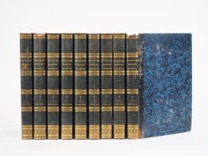 [DICTIONNAIRE]. GUÉRIN (F.-E.). DICTIONNAIRE PITTORESQUE D’HISTOIRE NATURELLE ET DES PHÉNOMÈNES DE LA NATURE. P., Au Bureau de Souscription, 1833-39. Neuf tomes très grand in-8 ½ basane vert bronze, dos cloisonné et orné, titre doré, tranches mouchetées (Reliure de l'époque). Épidermures et manques à 5 coiffes. ÉDITION ORIGINALE. Texte à 2 colonnes. Exemplaire complet du texte mais MANQUENT les 3 volumes d’atlas contenant 720 planches.