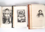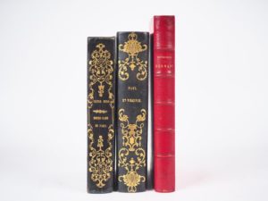 HUGO (V.). NOTRE-DAME DE PARIS. P., Perrotin, 1844. Grand in-8 ½ chevrette vert bronze à longs grains polis, plats de toile chagrinée à décor floral, dos lisse orné en long de fers dorés rocaille, titre doré (Reliure de l’époque). Rousseurs éparses. ÉDITION ILLUSTRÉE contenant 55 PLANCHES h.-t. et de nombreuses vignettes dans le texte. ¶ Clouzot, 145 – HERNANI. Drame en cinq actes. P., Conquet, 1890. Grand in-8 maroquin rouge, dos à nerfs, titre doré, date en queue, bordure intérieure ornée d’une large dentelle dorée, plats de la couverture conservés (Reliure de l’époque). Quelques rousseurs très éparses, petite épidermure au compartiment supérieur et à une coupe. ÉDITION ILLUSTRÉE d’un PORTRAIT d’après Devéria et de 15 COMPOSITIONS de Michelena gravés à l’eau-forte par Boisson. Tirage limité à 500 exemplaires, celui-ci numéroté sur vélin du Marais – BERNARDIN DE SAINT-PIERRE (J.-H.). PAUL ET VIRGINIE. P., Curmer, 1838. Fort volume grand in-8 ½ chagrin bleu nuit, plats de toile chagrinée vert lierre, dos lisse orné en long de fers dorés rocaille, titre doré (Reliure de l’époque). Rousseurs éparses. PREMIER TIRAGE de cette MAGNIFIQUE ÉDITION ILLUSTRÉE : 29 PLANCHES h.-t. sur Chine collé, environ 450 vignettes sur bois dans le texte, frontispice, carte couleurs et portraits. ¶ Carteret, III-522 – ENSEMBLE DE 3 OUVRAGES.