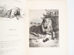 LA FONTAINE (J. de). FABLES DE LA FONTAINE. Paris, Hachette, 1868. In-folio ½ basane rouge vif à coins, dos lisse compartimenté et orné de fers dorés à décor Rocaille, tête dorée (Reliure légèrement postérieure). Teinte du dos éclaircie, petits frottements et épidermures. PREMIER TIRAGE de cette BELLE ÉDITION ILLUSTRÉE d’un PORTRAIT, de 84 PLANCHES à pleine page et de 248 vignettes dans le texte, gravées sur bois d'après les compositions de Gustave DORÉ. ¶ Leblanc, 205.
