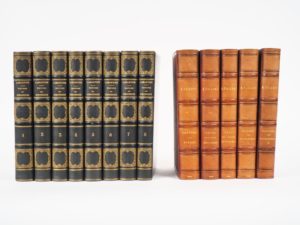 LAMARTINE (A. de). HISTOIRE DES GIRONDINS. P., Furne et Cie - Coquebert, 1847. Huit volumes ½ chagrin vert lierre, dos à nerfs orné, titre doré, (Reliure de l'époque). ÉDITION ORIGINALE. Portraits h.-t. sur vélin fort gravés sur acier – THIERRY (A.). RÉCITS DES TEMPS MÉROVINGIENS (1 vol.) – HISTOIRE DE LA CONQUÊTE DE L’ANGLETERRE PAR LES NORMANDS (2 vol.) – LETTRES SUR L’HISTOIRE DE FRANCE – DIX ANS D’ÉTUDES HISTORIQUES (1 vol.) – ESSAI SUR L’HISTOIRE DE LA FORMATION ET DES PROGRÈS DU TIERS ÉTAT (1 vol.). P., Furne et Cie, 1851-60. 5 volumes ½ chagrin violine, plats de toile chagrinée, dos à nerfs orné de caissons à froid, titre doré, tranches dorées (Quinet). Dos uniformément viré en teinte havane. NOUVELLE ÉDITION, revue et corrigée. SÉDUISANT EXEMPLAIRE en reliure signée. ENSEMBLE DE 5 OUVRAGES.