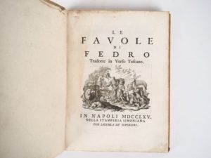 PHÈDRE. LE FAVOLE DI FEDRO. Tradotte in Verso Toscano. Napoli, Stamperia Simoniana, 1765. In-4 vélin ivoire, dos lisse, titre doré dans un encadrement de roulette dorée, tranches mouchetées (Reliure de l’époque). Petit manque de vélin en marge latérale du 1er plat, rousseurs claires. ÉDITION NAPOLITAINE ILLUSTRÉE de 21 VIGNETTES gravées en taille-douce, dont une grande vignette de titre et 11 lettrines historiées. Texte en latin et langue toscane en regard, traduite par Azzolino Malaspina.