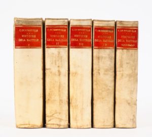 RENNEVILLE (C. de). L’INQUISITION FRANÇOISE ou L’HISTOIRE DE LA BASTILLE. Amsterdam, E. Roger, 1715-19. Cinq volumes in-12 vélin ivoire rigide, pièce de titre chagrin rouge du XIXe siècle (Reliure de l’époque). Ex-libris héraldique « Eugène Castel » [1883-1949]. ÉDITION ORIGINALE, complète du volume de supplément. PORTRAIT et 57 GRAVURES h.-t. gravées sur cuivre, dont 3 à double-page. Le volume de supplément contient à partir de la page 241 la Relation de l’Inquisition de Goa par Dellon. ¶ Bourgeois André, 6498 – Brunet, IV-1233.