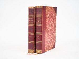 SAND (Maurice). MASQUES ET BOUFFONS (Comédie italienne). Textes et dessins. P., Henry, 1862. Deux volumes in-8 ½ maroquin grenat à coins, dos à nerfs filetés, fleurons à froid, titre doré, plats de la couverture conservés (Reliure de l’époque). Fentes aux mors, un plat détaché. ÉDITION ILLUSTRÉE de 50 magnifiques PLANCHES couleurs de costumes de la Commedia dell’arte. EN L’ÉTAT.