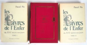 [BIBLIOGRAPHIE]. PIA (P.). LES LIVRES DE L’ENFER. Bibliographie critique des ouvrages érotiques dans leurs différentes éditions du XVIe siècle à nos jours. P., Coulet et Faure, 1978. Deux volumes in-8 brochés. ÉDITION ORIGINALE de cette importante bibliographie devenue un classique du genre. Tirage limité à 900 exemplaires. UN des 100 du tirage de tête numérotés sur Ingres, celui-ci non justifié – DICTIONNAIRE DES ŒUVRES ÉROTIQUES. Domaine français. Préface de Pascal Pia. P., Mercure de France, 1971. In-8 reliure skyvertex rouge décorée de l’éditeur. ÉDITION ORIGINALE. ENSEMBLE DE 2 OUVRAGES.