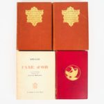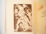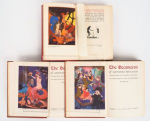 [BOSSCHÈRE]. APULÉE. L’ÂNE D’OR. À L’enseigne des Trois Magots, 1928. In-4 broché. ÉDITION ILLUSTRÉE de 67 COMPOSITIONS par Jean de BOSSCHÈRE : 1 eau-forte en frontispice, 12 h.-t. à pleine page (dont 6 couleurs), 46 vignettes et 8 culs-de-lampe. Tirage limité à 144 EXEMPLAIRES. UN des 110 numérotés sur Arches. E.A.S. de l’illustrateur : « à Bernard Steele / Souvenir de notre heureuse rencontre / amicalement / Jean de Bosschère » – BOCCACCIO (G.). THE DECAMERON. Translated by Richard Aldington. London, Putnam’s sons, 1930. Deux volumes grand in-8 percaline brique de l’éditeur, titre doré aux 1er plats, tête dorée. Griffure sur un plat, petit accroc et légères griffures à un dos. ÉDITION ILLUSTRÉE de 24 PLANCHES h.-t. (dont 16 en couleurs) par Jean de BOSSCHÈRE. Tirage limité à 2500 exemplaires numérotés sur vergé – FLAUBERT (G.). THE FIRST TEMPTATION OF SAINT ANTHONY. Translated by René Francis. London, John Lane The Bodley Head limited, 1924. Grand in-8 percaline rouge de l’éditeur, fers dorés aux 1er plat et dos, titre doré. Dos légèrement passé. ÉDITION ILLUSTRÉE de 20 PLANCHES h.-t. (dont frontispice) en couleurs et en noir par Jean de BOSSCHÈRE. Tirage limité à 3000 exemplaires numérotés. ENSEMBLE DE 3 OUVRAGES.