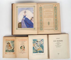[BRUNELLESCHI]. MUSSET (A. de). LA NUIT VÉNITIENNE – FANTASIO – LES CAPRICES DE MARIANNE. Grand in-4 ½ basane fauve marbrée à coins, dos cinq nerfs filetés, titre doré, tête dorée, plats de la couverture conservés (Reliure de l’époque). Paris, Piazza, [1913]. Mors frottés, épidermures. ÉDITION ILLUSTRÉE de 20 compositions en couleurs h.-t. sous serpentes légendées par U. BRUNELLESCHI. Tirage limité à 500 exemplaires numérotés sur Japon signés par l’artiste – DORAT. LES BAISERS, précédés du Mois de mai, poème. In-4 en ff. sous chemise et étui. ÉDITION ILLUSTRÉE de 23 COMPOSITIONS en couleurs h.-t. et d’ornements en couleurs dans le texte par U. BRUNELLESCHI. Tirage limité à 3200 exemplaires numérotés. UN des 500 enrichis d’une SUITE des illustrations en couleurs – VOLTAIRE. CANDIDE ou L’optimisme. Petit in-8 broché. ÉDITION ILLUSTRÉE de 16 h.-t. en couleurs d’U. BRUNELLESCHI. Tirage limité à 3000 exemplaires numérotés. ENSEMBLE DE 3 OUVRAGES.