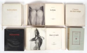 [CERCLE DU LIVRE PRÉCIEUX]. CALAFERTE (L.). SEPTENTRION – JOURIER (D.). LA ROBE. Reproductions photographiques de R. J. Ségalat – MUNTANER (J.). LES ÉCARLATES. Préface de Louis Pauwels. 15 illustrations de Arpad Elfer – BERG (P.). JOUR ET NUIT. Reproductions photographiques de Schnapp [tache claire au 1er plat] – EFFIAT (F.). L’HEURE DU CHER CORPS – SADUT (C.). THÉRÈSE ou La Soumission. 12 gravures originales h.-t. de F. Dannat. 5 volumes in-4 toile blanche ou noire, titre doré au dos et sur le 1er plat et 1 volume en ff. sous chemise et étui. P., Cercle du Livre Précieux, 1962 [1er volume] et 1963. Tirage limité et numéroté. ENSEMBLE DE 6 OUVRAGES ÉROTIQUES.