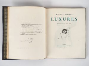 DEKOBRA (M.). LUXURES. P., Éditions d’Art des Tablettes, 1924. Grand in-4 ½ chagrin noir à coins, dos à nerfs, fleuron et titre dorés, plats de la couverture conservés (Reliure de l’époque). Teinte du dos virée en teinte havane. ÉDITION ORIGINALE ILLUSTRÉE de 2 DESSINS en couleurs, 2 GRAVURES sur cuivre et de nombreuses illustrations en noir de Charles GIR. Tirage limité à 360 EXEMPLAIRES. UN des 300 numérotés sur vélin d’Arches, signés à la justification par l’auteur et l’illustrateur. ¶ Dutel, 1825 – Pia, 750.