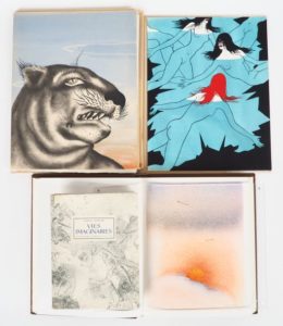 DESNOS (Robert). LE BAIN AVEC ANDROMÈDE. Poème. P., Éditions de Flore, 1944. Grand in-4 en ff., couverture illustrée couleurs, chemise. ÉDITION ORIGINALE ornée de 10 LITHOGRAPHIES couleurs (dont couverture) à pleine page de Félix LABISSE. Tirage limité à 387 exemplaires. UN des 350 numérotés sur vélin à la forme de Rives – SCHWOB (M.). VIES IMAGINAIRES. P., Éditions Lumière, 1946. In-4 broché. ÉDITION ILLUSTRÉE de 22 DESSINS à pleine page de Félix LABISSE. UN des 1500 numérotés sur vélin pur fil – PRÉVERT (J.). FATRAS. P., Sauret, 1980. Grand in-4 skyvertex havane de l’éditeur, étui bordé. ÉDITION ILLUSTRÉE d’AQUARELLES à pleine page de FOLON. UN des 3600 numérotés sur grain de Rives. ENSEMBLE DE 3 OUVRAGES.