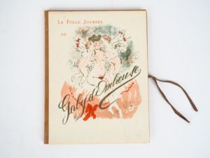 FOLLE JOURNÉE DE GABY D’OMBREUSE (La). Les Compagnons de la Belle Époque, [Henri Pasquinelli, fin des années 1940]. In-folio en ff. sous chemise cartonnée muette à rubans ; (1) f. bl., (1) f. de justification du tirage et 28 planches (dont titre). RECUEIL DE 28 LITHOGRAPHIES ORIGINALES LIBRES en couleurs sur papier Japon par BERTHOMMÉ SAINT-ANDRÉ. Édition hors-commerce, au tirage limité à 350 exemplaires numérotés, celui-ci augmenté d’une SUITE des lithographies avec remarques sur papier bleuté filigrané Japon. ¶ Dutel, 1590.