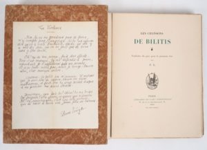 LOUŸS (P.). LES CHANSONS DE BILITIS. P., Librairie de l’Art Indépendant, 1895 [achevé d’imprimer 3 décembre 1894]. Petit in-4 broché, couverture rempliée, chemise et étui cartonnés modernes. Plats en partie roussis, taches au dos. ÉDITION ORIGINALE de ce recueil de poèmes érotiques et passionnés dédié à André Gide et plus discrètement, à la danseuse de Biskra, Meriem ben Atala. Un des 480 exemplaires numérotés sur vélin, après 10 Japon et 10 Chine. Exemplaire enrichi d’un POÈME AUTOGRAPHE SIGNÉ de Pierre LOUŸS intitulé La Violence (1 f. 190 X 152 mm). Ce poème fait partie des 21 pièces nouvelles des Épigrammes dans l’île de Chypre de la 2nde édition parue en 1898 des Chansons de Bilitis, en partie originale. ¶ Talvart, XII-320, 9 a.