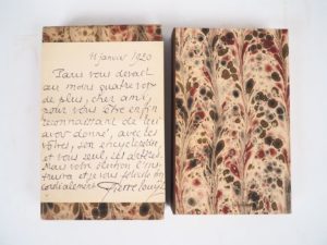 LOUŸS (P.). LES AVENTURES DU ROI PAUSOLE. P., Charpentier et Fasquelle, 1901. Grand in-8 broché, couverture rempliée, chemise et étui de l’époque. ÉDITION ORIGINALE. Tirage limité à 380 exemplaires. Un des 300 numérotés sur vélin. Exemplaire enrichi d’une LETTRE AUTOGRAPHE SIGNÉE de Pierre LOUŸS : « 11 janvier 1920 / Paris vous devait au moins quatre voix de plus, cher ami, pour vous être enfin reconnaissant de lui avoir donné, avec les vôtres, son encyclopédie, et vous seul, ses artères. Mais votre élection l’instruira et je vous félicite très cordialement. Pierre Louÿs » (1 page sur un f. double). ¶ Talvart, XII-331.