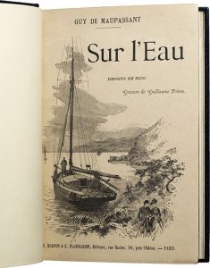 MAUPASSANT (Guy de). Sur l'eau. Paris, Marpon & Flammarion, s.d. [1888]. In-12, maroquin bleu nuit janséniste, coiffes guillochées, filets sur les coupes, tranches dorées sur témoins, jeu de filets dorés intérieur, couverture et dos, étui...