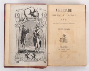 PALLAVACINO (F.). ALCIBIADE ENFANT À L’ÉCOLE. D.P.A. Traduit pour la première fois de l’italien par Ferrante Palllavicino. Orange, Iuann Vvart, 1652 [1861 ?]. [Relié à la suite :] UN POINT CURIEUX DES MŒURS PRIVÉES DE LA GRÈCE par O. D*** suivi d’une notice bibliographico-littéraire. Athènes, 1871. Deux ouvrages reliés en un volume in-12 ½ chagrin rouge, dos à nerfs, titre doré, date en queue (Saulnier) ; 164 pp. – 35 pp., (1) p. de table. ÉDITION ILLUSTRÉE en FRONTISPICE d’une gravure libre tirée sur Chine titrée Alcibiade enfant à l’école. Cet ouvrage, l’un des premiers écrits érotiques homosexuels imprimés en occident, est attribué à Ferrante Pallavicino mais également à Antonio Rocco. Tirage limité à 151 EXEMPLAIRES pour les 2 ouvrages. UN des 130 et UN des 150 imprimés sur vergé fort. ¶ Pia, 10, qui ne mentionne pas la gravure - Manque à Dutel qui mentionne 3 autres éditions.